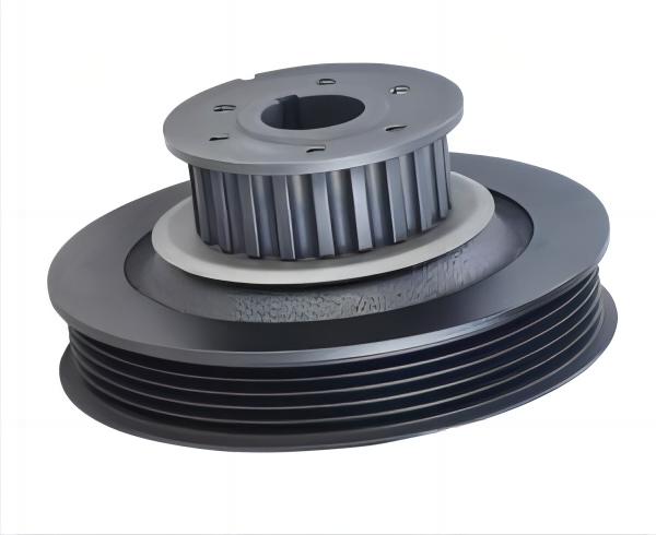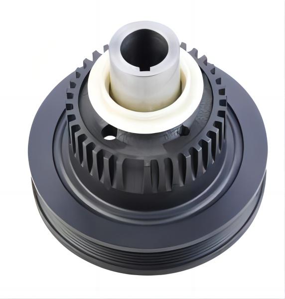 曲軸減震皮帶輪,是發動機前端附件系統的重要零件之一,分為橡膠減震皮帶輪、硅油扭轉減震皮帶輪及橡膠硅油復合型扭轉減震皮帶輪,基本結構一般由輪轂、外圈、橡膠組成,大多安裝于曲軸的前端,傳遞曲軸輸出的扭矩以驅動輪系附件。